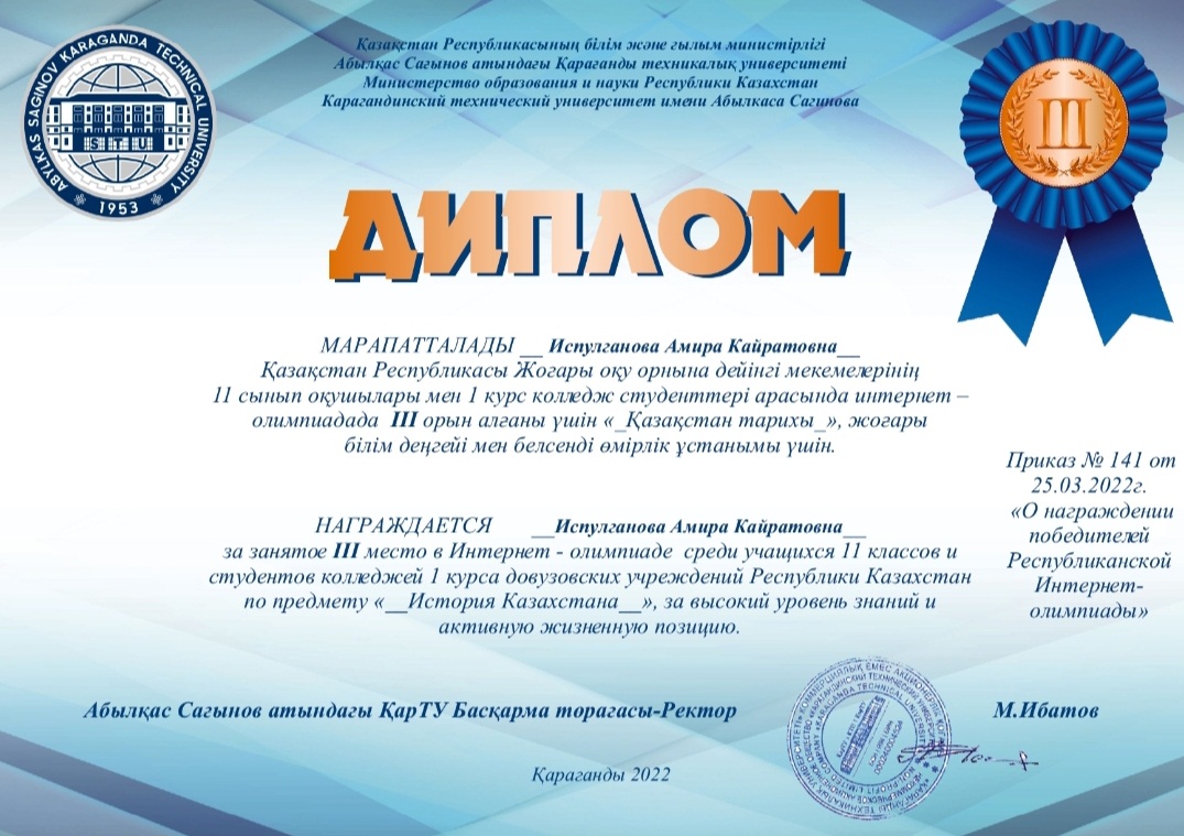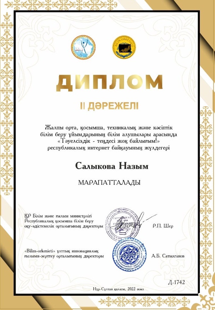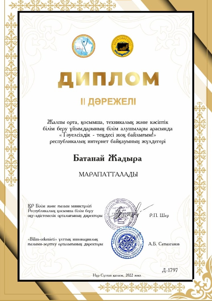 - 1 – орын командалық қатысуда студенттер Бота Еркемай, Кенжабаева Аружан, Мусина Альмира;