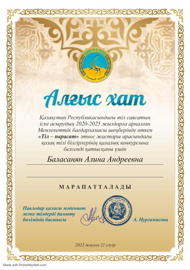 - 2 командное место в соревнованиях по «Тоғызқұмалақ» Колледждер арасында 2 лиганың XXXII облыстық спартакиадасы аясында "Тоғызқұмалақ" бойынша жарыстарда 2 командалық орын Павлодар қ. Маженова Ақжұніс және Жукова Дарья;